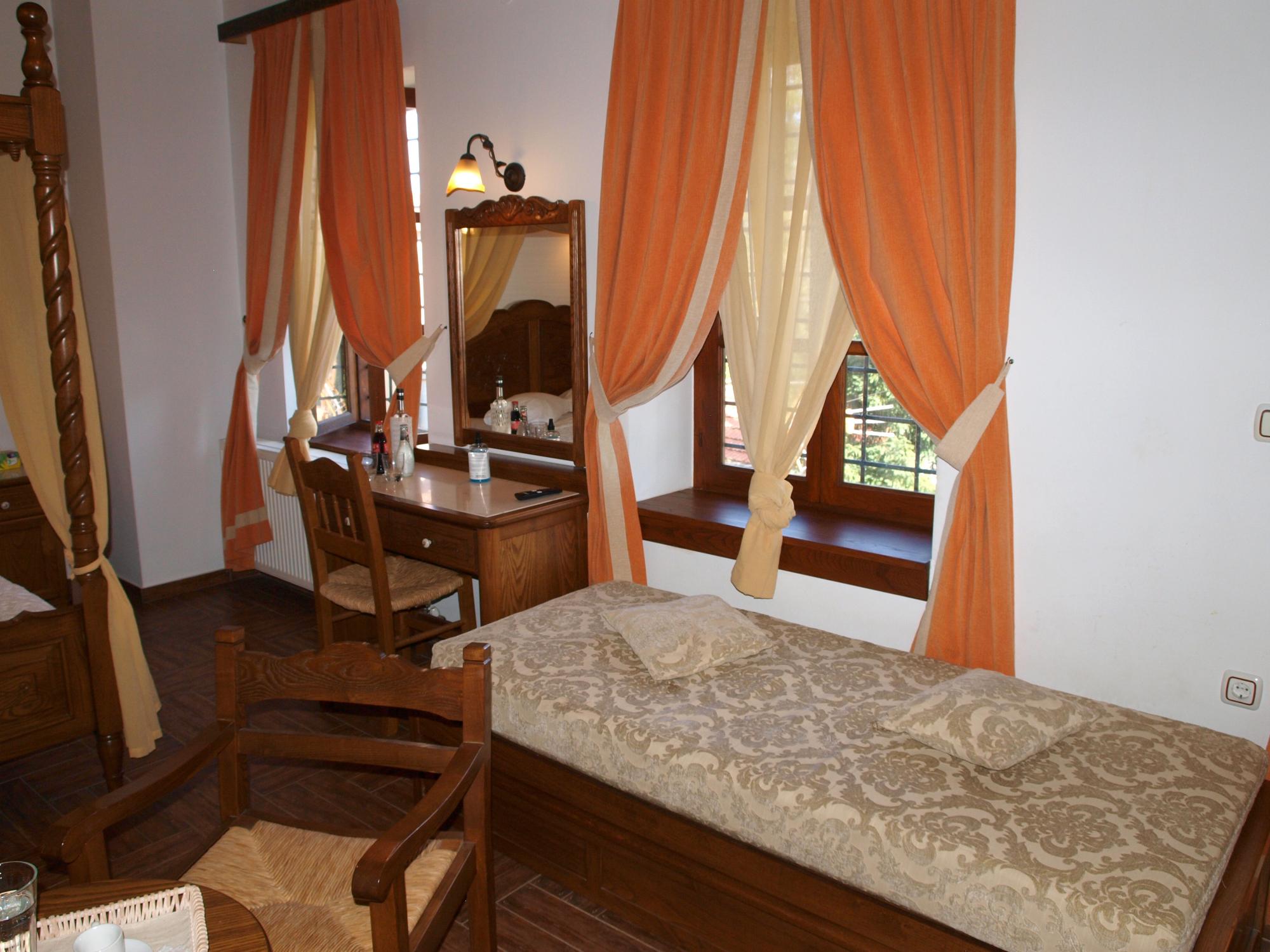 As a Superior Triple Room, this space is designed to comfortably accommodate three guests, offering notable features beyond the standard level for a more rewarding stay. 1 While maintaining the mansion’s authentic character with rustic design, wooden-crafted ceilings, and draped curtains, it is equipped with modern amenities like flat-screen TV and free Wi-Fi.
